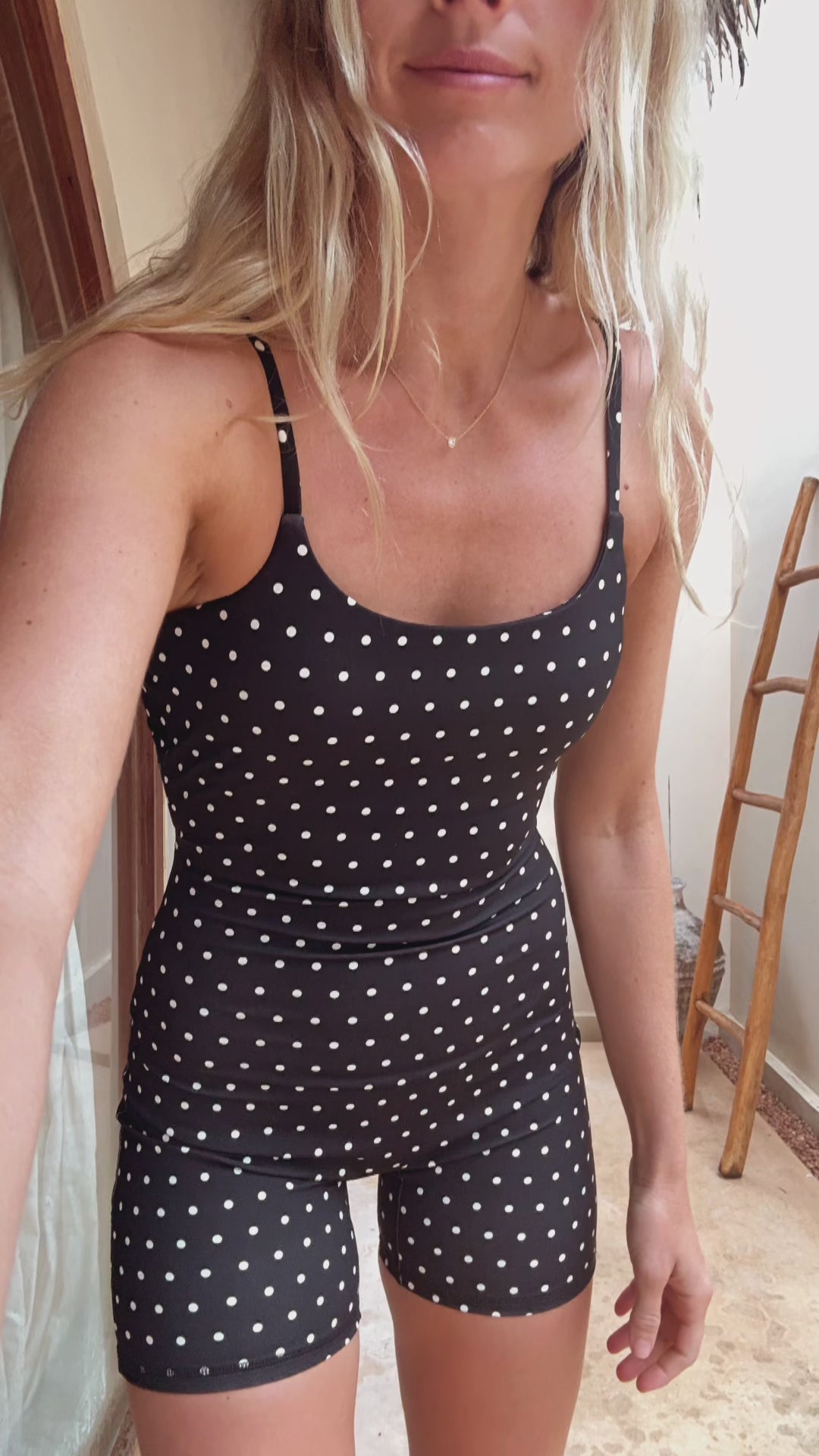 The Rhea Onesie is made from our activewear material, but this material can also be worn for swimming and in the ocean.