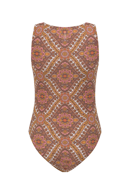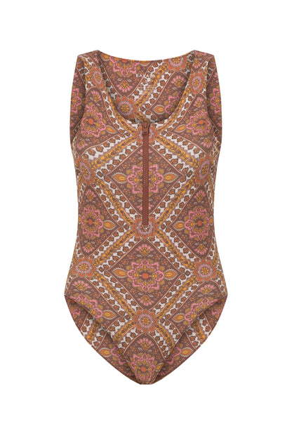The Palais collection captures the magic of Morocco - wandering through the tiled riads,desert landscapes,and golden coastlines. With a pallet of warm terracottas, soft sands, and intricate prints reminiscent of Moroccan mosaics, Palais evokes the feeling of adventure, mystery, and timeless beauty. Designed for the modern-day nomad, each piece blends high-performance surf functionality with effortlessly feminine silhouettes โ€” so you can flow from morning waves to sunset strolls through stunning souks.